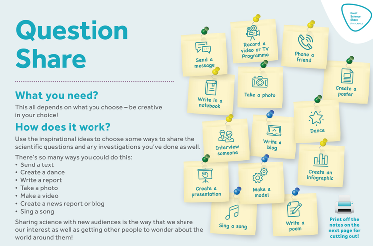 Sharing inspires us to communicate the questions and conclusions from our investigations with new audiences. Encourage your pupils to share in a way that they may not have considered before by using the Great Science Sharing Prompts for ideas.