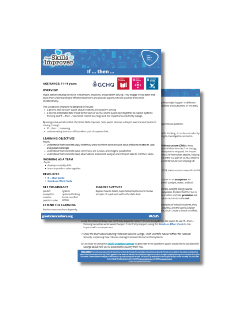 a science embedded task linked to the work of GCHQ, where pupils work together to explore systems thinking and ‘if… then…’ scenarios related to energy and the impact of an electricity outage.