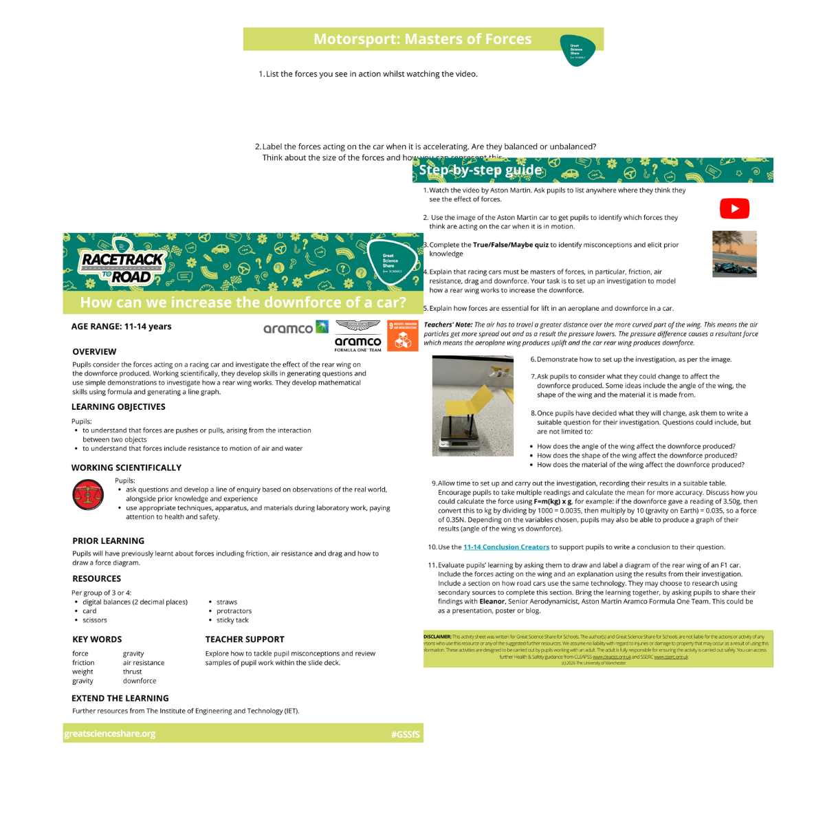 Inspire pupils to ask, investigate and share scientific questions with Racetrack to Road whilst exploring the concept of forces through the context of motorsport. Pupils consider the forces acting on a car and investigate how they can reduce them to enhance the performance of the car. Working scientifically, they develop skills in recording and interpreting data.